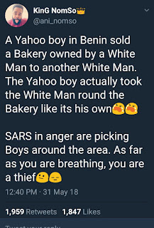 Popular Nadia Bakery located opposite the University of Benin was sold to a white man for 25 million naira by a scammer / yahoo boy. The Nadia bakery belongs to a white man and the scammer sold it and even gave a tour of the facility to the buyer. Since the incident occur,the yahoo boy as fled and SARS are reportedly on the case. A twitter user shares the incident,read screenshots for full gist…