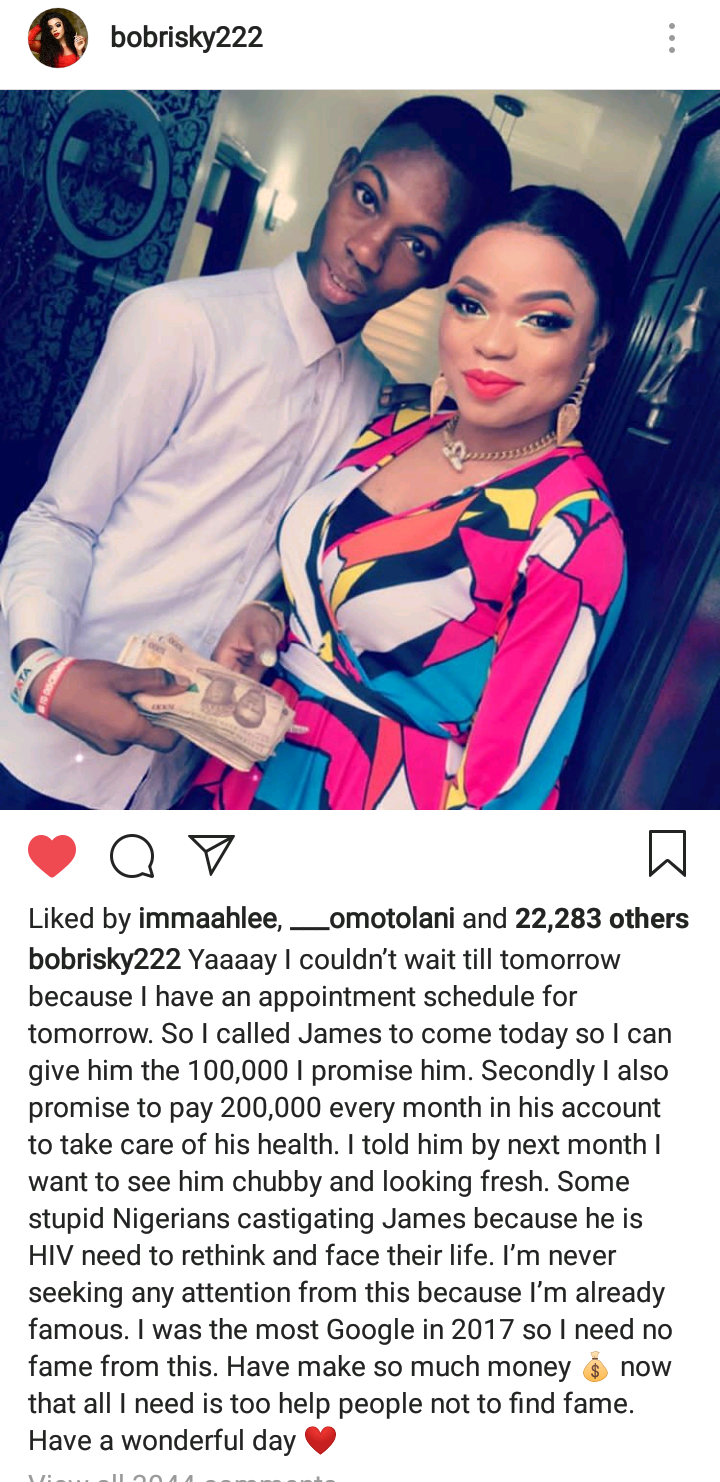 After singing high praises of James who went viral on social media a month back, Popular Nigerian cross dresser Bobrisky has meet him and fulfills promise of a 100k naira and promise 200k monthly allowance for his health. Bobrisky shared their encounter on social media. More after the cut…