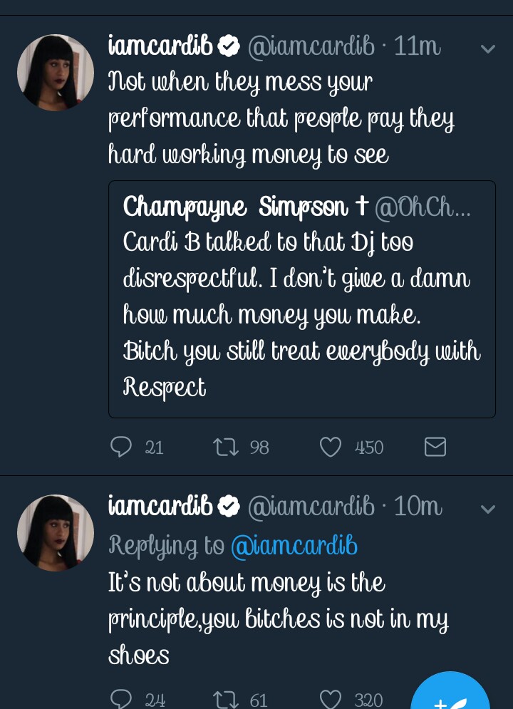 others Cardi B calls out DJ for poor performance at her Gig on Twitter h Last updated: 2017/10/01 at 7:10 AM By Blackdotmandy 0 Min Read Share SHARE After the DJ apparently went off during her performance, she said to him “are you dumb? ” The videos went viral and she tweets on the issue and even compare the incident to Notorious BIG actions… See tweets below.. You Might Also Like NEW TUNE TO HIT THE AFRICAN MUSIC INDUSTRY SOON! THE DENIAL OF MODERN DAY RACISM CARDI B AND OFFSET ARE OFF !! 3 ARRESTED FOR TORTURE Blackdotmandy October 1, 2017 Share this Article Facebook Twitter Whatsapp Whatsapp Previous Article Wizkid Makes History As The Second African Artist After Sade To Sell Out At The Royal Albert Hall In London Next Article Music: Sophia X Finish (Produced by Dapiano) Leave a comment Leave a Reply Cancel replyYour email address will not be published. Required fields are marked *Comment * Name * Email * Save my name, email, and website in this browser for the next time I comment. Δ Stay Connected Facebook Like Twitter Follow Instagram Follow Youtube Subscribe Latest News The Men Of Love Island Are On An All Expense Paid Trip In Mallorca Reality TV The Perks Of Dating A Content Creator Lifestyle Fenty Beauty UK Unveils Denola Grey As The New Face Of The Brand Beauty Fenty Lifestyle Hilda Baci Goes On The Timer For Four Days Cook-a-thon To Set A New Guinness World Record Lifestyle