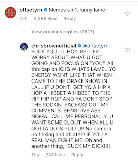 Celebrity GistCelebrity NewsHollywoodMusic CHRIS BROWN ABOUT TO BEAT THE TWO F OFF MIGOS RAPPER “OFFSET” Last updated: 2019/02/07 at 9:30 AM By Blackdotmandy 0 Min Read Share SHARE American Rappers Chris Brown and Offset had a small feud after Chris Brown posted a meme of Sir Savage the 21st and Offset wasn’t feeling it and Chris Brown dragged him, we’ve got screenshot…… After the cut… You Might Also Like Femme Fest 2023: A One-Day Female Lineup Festival In Lagos Nigeria This Saturday It’s Rema’s Turn, From Billboard Hot 100 To Most Viewed Nigerian Music Video On Youtube, This Benin Boy Just Doesn’t Stop. Favi (Gidi Boy) Rocks New Look and Teases New single “Too Many” Layzee Ella Releases Debut Music Video for Lead Single “Medusa” Blackdotmandy February 7, 2019 Share this Article Facebook Twitter Whatsapp Whatsapp Previous Article [NEW MUSIC] A.D.A.M FT LAYZEE ELLA – NATIONAL MOI MOI Next Article CARDI B COVERS HARPER’S BAZAAR AND REENACT THE CARDI B VS NICKI’S SCENE Leave a comment Leave a Reply Cancel replyYour email address will not be published. Required fields are marked *Comment * Name * Email * Save my name, email, and website in this browser for the next time I comment. Δ Stay Connected Facebook Like Twitter Follow Instagram Follow Youtube Subscribe Latest News The Men Of Love Island Are On An All Expense Paid Trip In Mallorca Reality TV The Perks Of Dating A Content Creator Lifestyle Fenty Beauty UK Unveils Denola Grey As The New Face Of The Brand Beauty Fenty Lifestyle Hilda Baci Goes On The Timer For Four Days Cook-a-thon To Set A New Guinness World Record Lifestyle