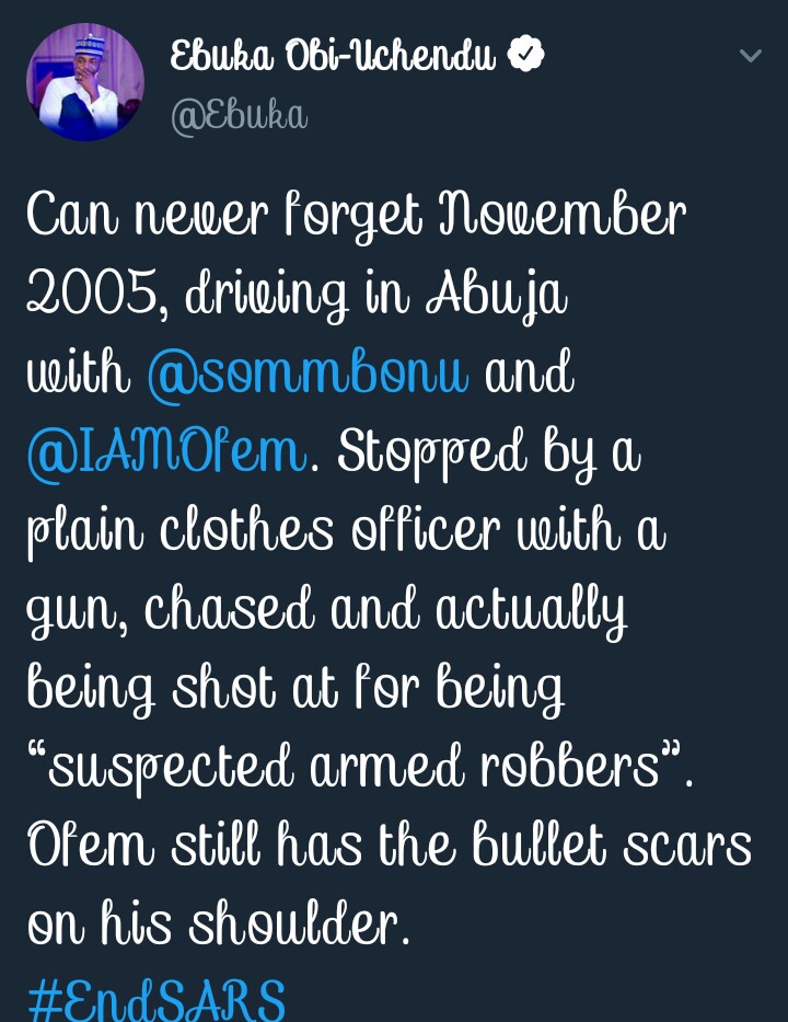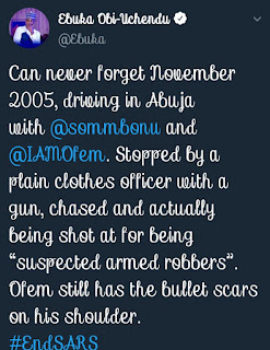 In the light of the ongoing EndSARS campaign, Ebuka and two of his friends shared their ordeal they had with SARS at Abuja in ’05. According to him they were attacked and shot at for being suspected Armed robbers and one of them even have scars from the gunshot wound till date. See below.