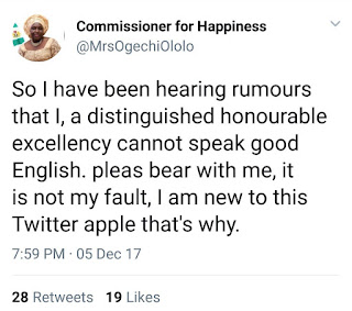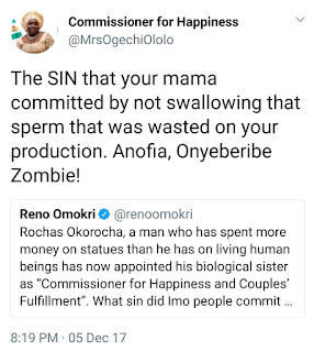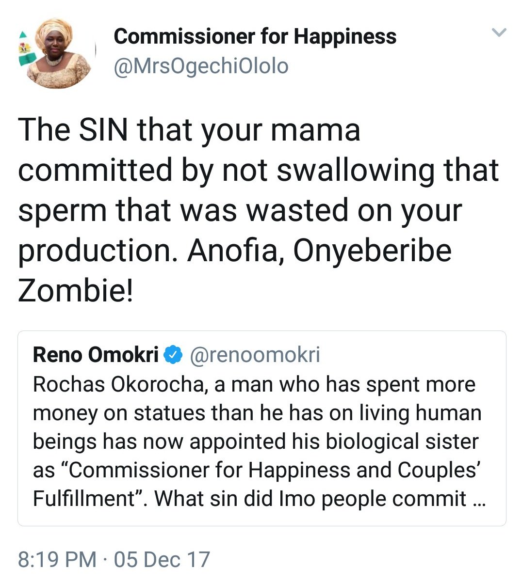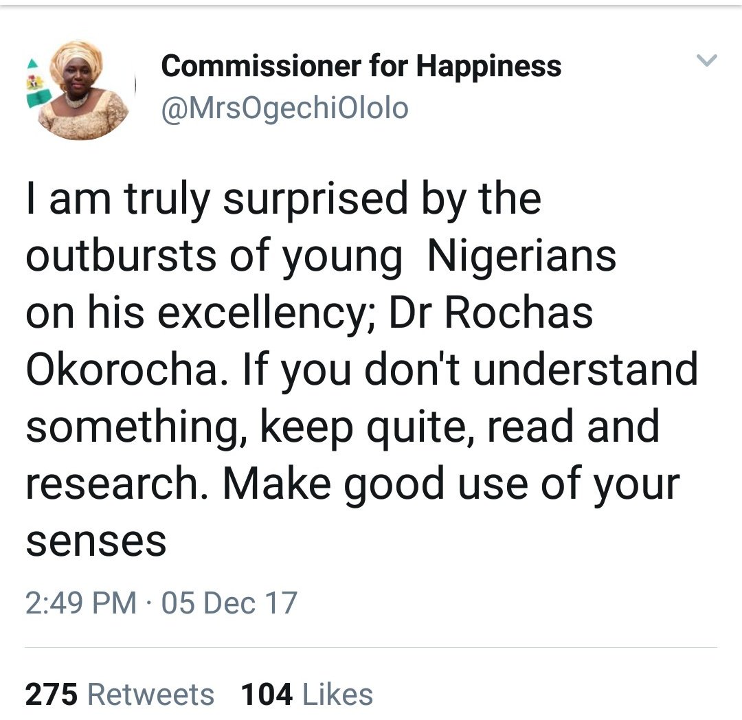 Mrs Ogechi Okpolo is the biological sister to Governor Rochas of Imo State. She was appointed into a new office of Commissioner of Happiness and couple’s fulfilment, but really of what importance is all this. Seeing from her tweets she’s quite insensitive as her brother. See below
