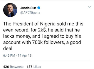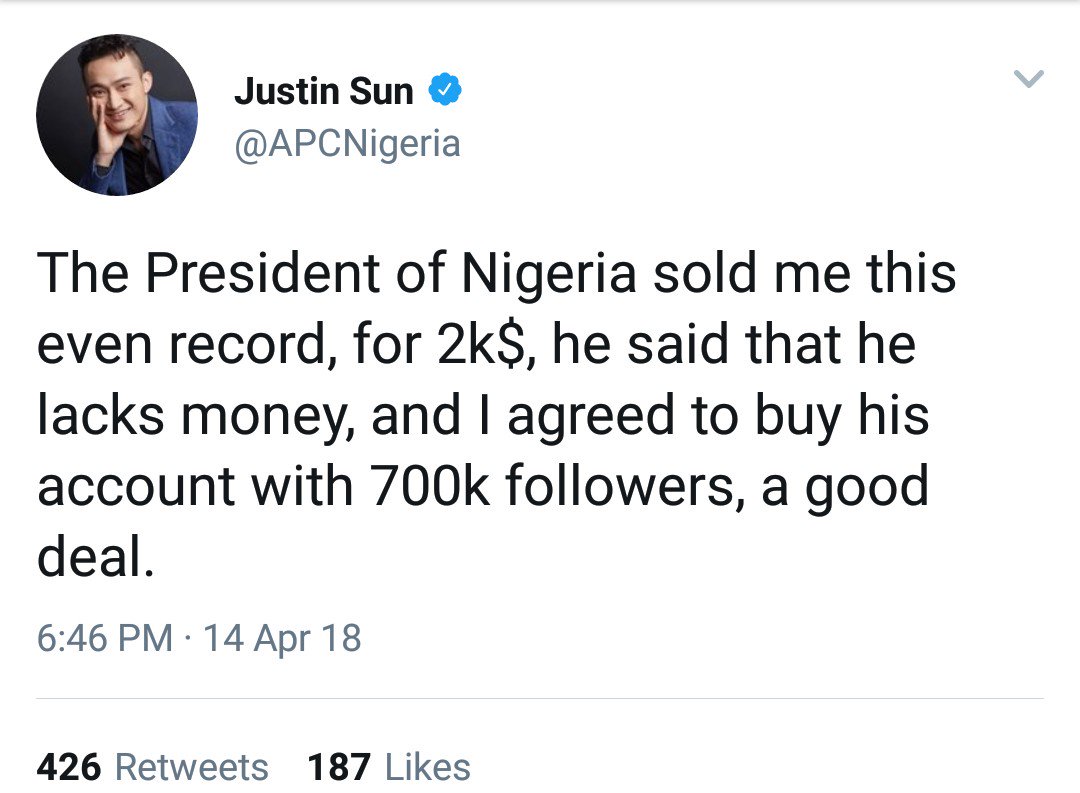 Is it not Nigeria again? ๐ They have sold the official twitter handle to an Asian Businessman Justin Sun who is invloved in Bitcoin business. According to Justin, The Nigerian President said he’s broke and agreed to sell APC account for 2000 dollars๐๐๐.The guy even offered to buy the country. See the full gist after the cut……