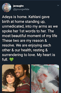Adeya is home. Kehlani gave birth at home standing up, unmedicated, into my arms as we spoke her 1st words to her. The most beautiful moment of my life. These two are my reason & resolve. We are enjoying each other & our health, resting & surrendering to love. My heart is full. 💚