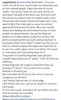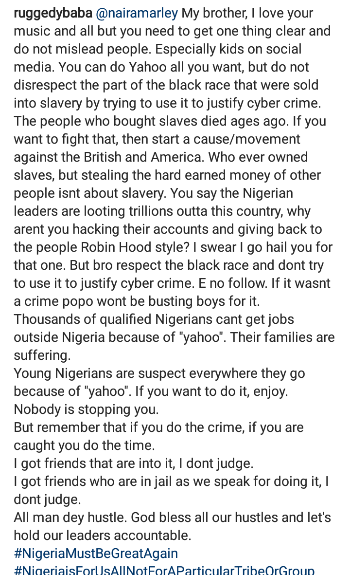 And Veteran Singer Ruggedman wasn’t welcoming on the post and called him out to stop praising the act and using the Slavery Card to justify it as the imagery of yahoo has done harm on Nigerians abroad who find it hard to get jobs and feed their family.