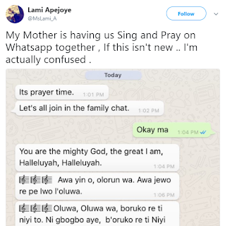 others Nigerian Lady shares Family Whatsapp Group where Her Mum hold Praise and Worship with the Family Last updated: 2017/12/14 at 4:47 PM By Blackdotmandy 0 Min Read Share SHARE The lady shoves shares screenshots of her family whatsapp group and her mother makes the entire family sing and pray online, like she types word by word. I know Nigeria moms are great but this is way extra….. See below You Might Also Like NEW TUNE TO HIT THE AFRICAN MUSIC INDUSTRY SOON! THE DENIAL OF MODERN DAY RACISM CARDI B AND OFFSET ARE OFF !! 3 ARRESTED FOR TORTURE Blackdotmandy December 14, 2017 Share this Article Facebook Twitter Whatsapp Whatsapp Previous Article Cardi B buys fiance “Migos” Offset a $320k Rolls Royce Wraith for his 26th birthday Next Article Reasons why you should just Retweet and Go.. See this Trailer Jam Leave a comment Leave a Reply Cancel replyYour email address will not be published. Required fields are marked *Comment * Name * Email * Save my name, email, and website in this browser for the next time I comment. Δ Stay Connected Facebook Like Twitter Follow Instagram Follow Youtube Subscribe Latest News The Men Of Love Island Are On An All Expense Paid Trip In Mallorca Reality TV The Perks Of Dating A Content Creator Lifestyle Fenty Beauty UK Unveils Denola Grey As The New Face Of The Brand Beauty Fenty Lifestyle Hilda Baci Goes On The Timer For Four Days Cook-a-thon To Set A New Guinness World Record Lifestyle
