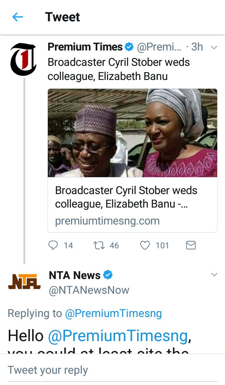 Premium Times shares the news of wedding between NTA broadcasters Cyril Stober and Elizabeth Banu without  citing NTA as it source ,NTA made sure they pointed it out with a major shade at Linda Ikeji  . See below….