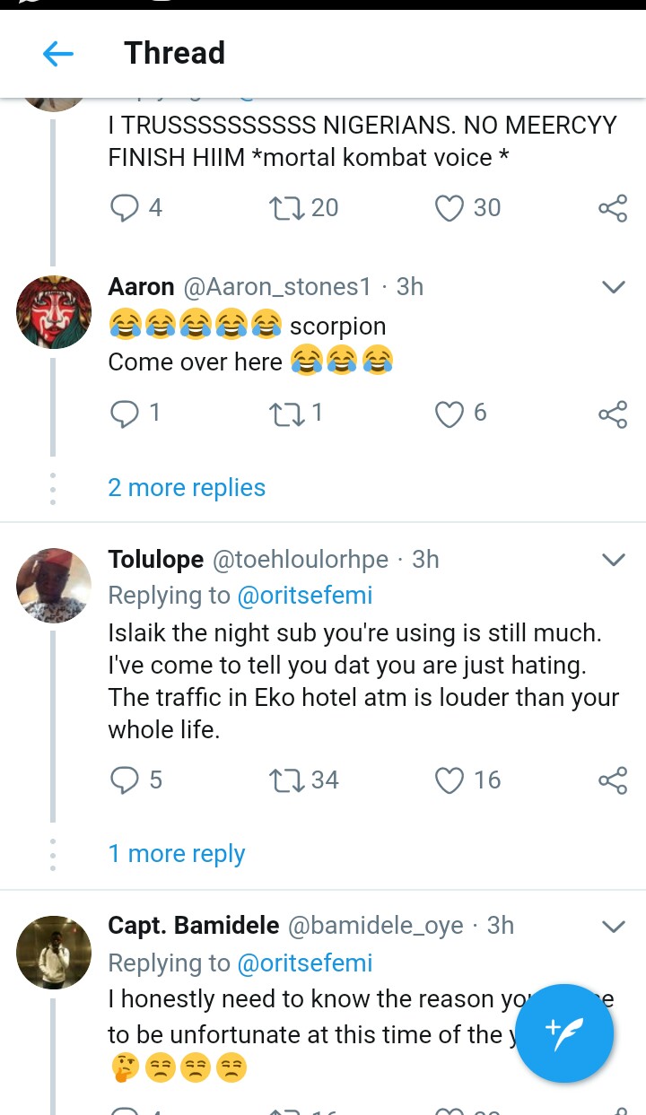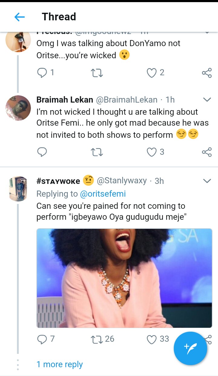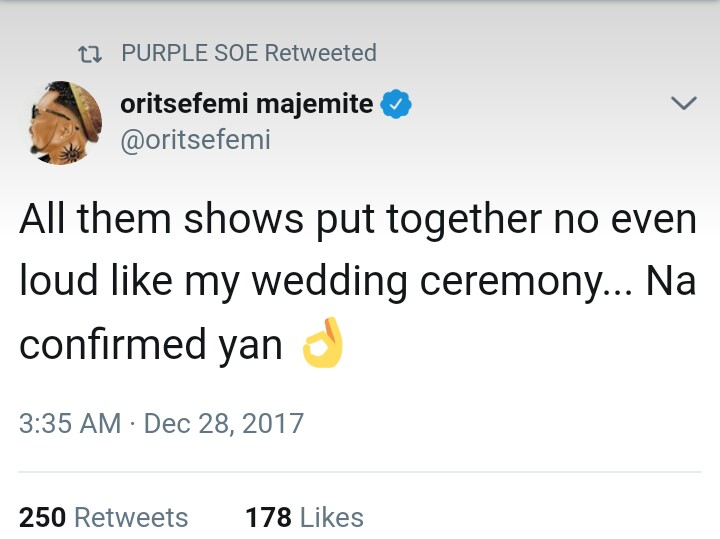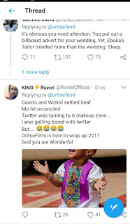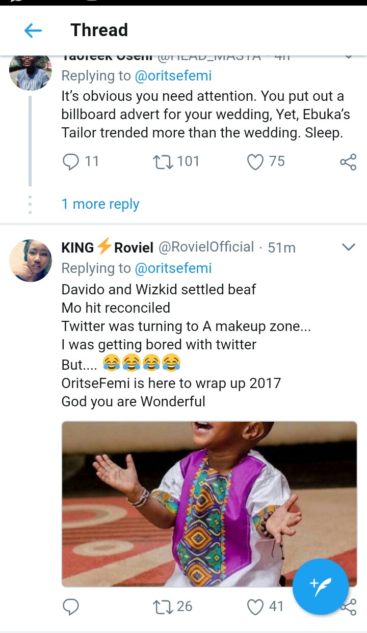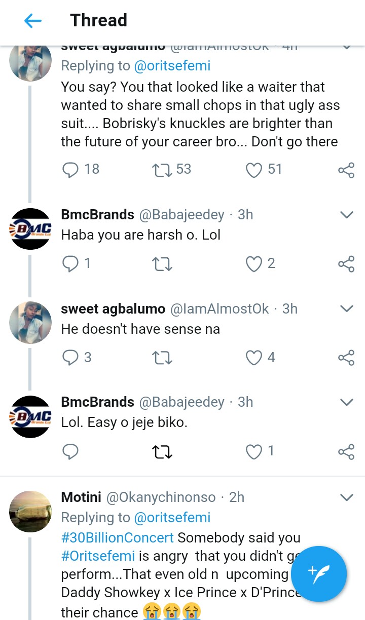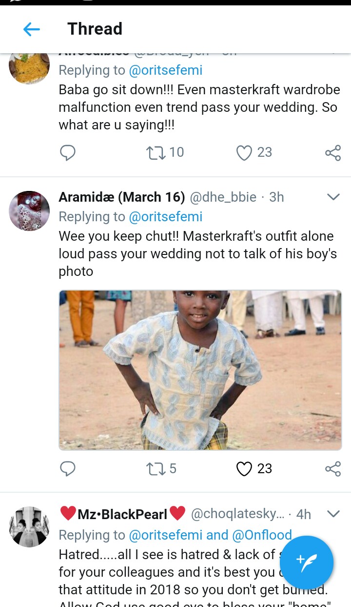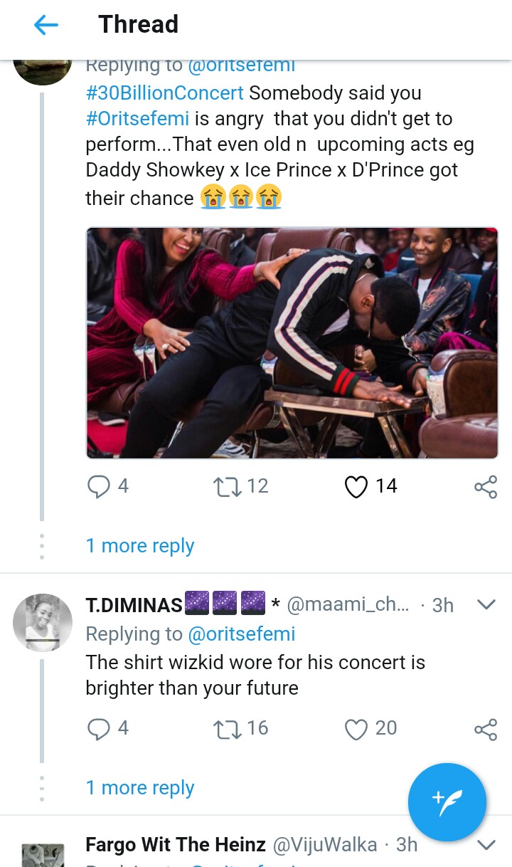 others Oritsefemi Under Attack from Wizkid and Davido’s Fans after this Single Tweet Last updated: 2017/12/28 at 7:13 AM By Blackdotmandy 0 Min Read Share SHARE Oritsefemi came for all artist who held concert today, but he tweeted this while Davido’s concert was on. Trust the fans of Wizkid and Davido to attack him after this tweet…… See replies below You Might Also Like NEW TUNE TO HIT THE AFRICAN MUSIC INDUSTRY SOON! THE DENIAL OF MODERN DAY RACISM CARDI B AND OFFSET ARE OFF !! 3 ARRESTED FOR TORTURE Blackdotmandy December 28, 2017 Share this Article Facebook Twitter Whatsapp Whatsapp Previous Article See This Little Boy Remake Ebuka Famous #BAAD2017 Outfit Next Article South African Rapper AKA and Media Personality Bonang Matheba Call it Quits Again Leave a comment Leave a Reply Cancel replyYour email address will not be published. Required fields are marked *Comment * Name * Email * Save my name, email, and website in this browser for the next time I comment. Δ Stay Connected Facebook Like Twitter Follow Instagram Follow Youtube Subscribe Latest News The Men Of Love Island Are On An All Expense Paid Trip In Mallorca Reality TV The Perks Of Dating A Content Creator Lifestyle Fenty Beauty UK Unveils Denola Grey As The New Face Of The Brand Beauty Fenty Lifestyle Hilda Baci Goes On The Timer For Four Days Cook-a-thon To Set A New Guinness World Record Lifestyle