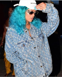 The LOVE ON THE BRAIN singer is presently in Barbados for the annual cropover set to hold 7 August. And feeling adventurous when it came to her latest image overhaul, Rihanna chose to ditch her trademark raven locks for a bright blue shade instead,after all she is but a fashion killer.. She attended the Elevate ST.  Tropez festival party last night.Another photo after the cut