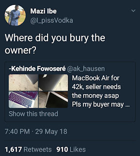 So one uncle wanted to sell a MacBook Air for 42k on the TL, something that’s worth 360k-435k , he had a list of spontaneous replies from people because they have seen free goods. But another twitter just had to ask a very important question and it’s quite hilarious… See the post after the cut.