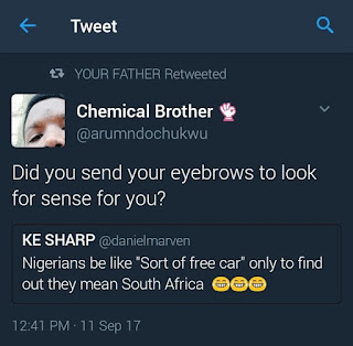 others Twitter Savage : Between a South African and a Nigerian Last updated: 2017/09/12 at 1:18 PM By Blackdotmandy 0 Min Read Share SHARE You’d know better than come for Nigerians on twitter. Nigerians have since lost their chill…. See the reply below You Might Also Like NEW TUNE TO HIT THE AFRICAN MUSIC INDUSTRY SOON! THE DENIAL OF MODERN DAY RACISM CARDI B AND OFFSET ARE OFF !! 3 ARRESTED FOR TORTURE Blackdotmandy September 12, 2017 Share this Article Facebook Twitter Whatsapp Whatsapp Previous Article Check Out These African Pattern Ankara Necklace Next Article Gucci Mane Announces New Album “MR DAVIS” and Release Date Leave a comment Leave a Reply Cancel replyYour email address will not be published. Required fields are marked *Comment * Name * Email * Save my name, email, and website in this browser for the next time I comment. Δ Stay Connected Facebook Like Twitter Follow Instagram Follow Youtube Subscribe Latest News The Men Of Love Island Are On An All Expense Paid Trip In Mallorca Reality TV The Perks Of Dating A Content Creator Lifestyle Fenty Beauty UK Unveils Denola Grey As The New Face Of The Brand Beauty Fenty Lifestyle Hilda Baci Goes On The Timer For Four Days Cook-a-thon To Set A New Guinness World Record Lifestyle