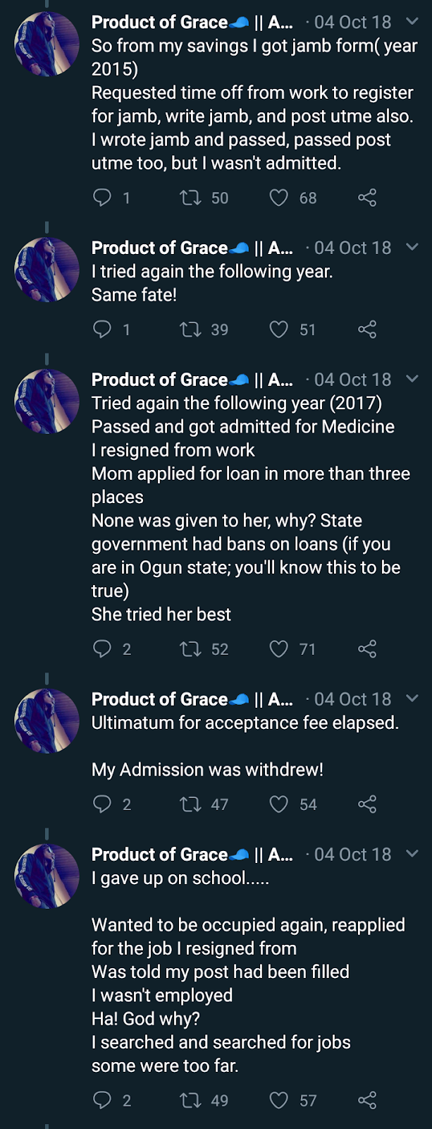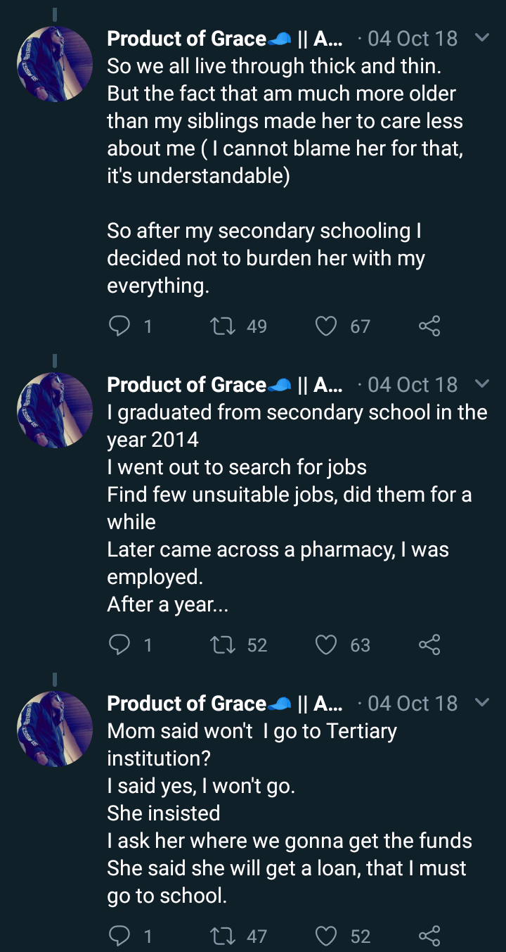 Am victor by name, Male, 21.Lost my dad when I was just 6.Mom didn’t wanted to remarry, but grandma won’t let her; she says she can’t have just one kid.She remarried and gave birth to her second born when I was 11. She gave birth to two more kids.We were 4 now Altogether. But she and my step-dad had frequent fights.They broke up and live separately My mom with the kids step-dad not helping in any way,so she’s literally a single mother of four kids and she’s just a primary school teacher. So we all live through thick and thin.But the fact that am much more older than my siblings made her to care less about me ( I cannot blame her for that, it’s understandable) So after my secondary schooling I decided not to burden her with my everything. I graduated from secondary school in the year 2014.I went out to search for jobs Find few unsuitable jobs, did them for a while.Later came across a pharmacy, I was employed. After a year…Mom said won’t I go to Tertiary institution?I said yes, I won’t go.She insisted , I ask her where we gonna get the funds she said she will get a loan, that I must go to school..So from my savings I got jamb form( year 2015) Requested time off from work to register for jamb, write jamb, and post utme also. I wrote jamb and passed, passed post utme too, but I wasn’t admitted.I tried again the following year.Same fate! Tried again the following year (2017) Passed and got admitted for Medicine i resigned from work Mom applied for loan in more than three places,none was given to her, why? State government had bans on loans (if you are in Ogun state; you’ll know this to be true) She tried her best Ultimatum for acceptance fee elapsed.My Admission was withdrew! I gave up on school…..Wanted to be occupied again, reapplied for the job I resigned from Was told my post had been filled I wasn’t employed Ha! God why?I searched and searched for job some were too far. I started pick up on petty jobs like “labourer”and “joinman” for artisans. Mom married another man again She took in my three siblings with her They are doing good, so to speak.Have been living alone since then; 8 months now.So the reality of life begin to dawn on me, I started thinking about my future, Like I really don’t have something tangible doing. I feel wretched i feel doomed . I ask myself where I had it wrong so this last few weeks hasn’t been easy coz I am really sick and can’t take up on my petty jobs. So no money to feed not to talk of buying drugs .Thought of suicide flows in, but I decided to cry out first.