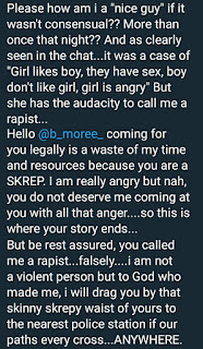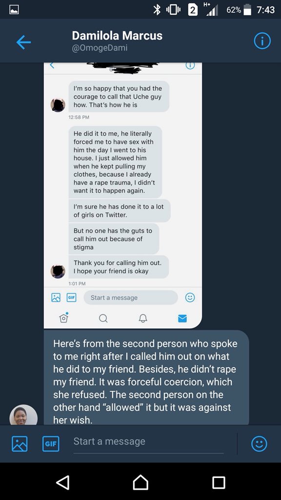 So Twitter is on lock down with the Berger to Ajah trend because a female Twitter user Damilola accused a male Twitter user Uche of Raping her friend along the line another user reported @b_moree_ reported she also went through same with Uche.