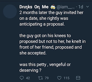 Twitter Twitter User Shares Story Of A Rejected Proposal Which Ended Up With The Guy Marrying His Ex Girlfriend Last updated: 2018/06/12 at 1:11 AM By Blackdotmandy 0 Min Read Share SHARE So he proposed to his girlfriend but she rejected and later apologized saying she wasn’t ready and he should propose again, but he ended up proposing to her friend right in her very presence. See SS for full gist.. You Might Also Like TWITTER SERIES: CHIOMA MISSES JOB OPPORTUNITY BECAUSE OF “HOW DID YOU GET MY NUMBER “ PERUZZI ASSAULTS POPULAR NIGERIAN INFLUENCER BECAUSE OF AN OLD TWEET OF TENI BEING BETTER THAN HIM WIZKID’S EX JUSTINE SKYE CONSIDERS COMING TO NIGERIA AFTER RECIEVING MULTIPLE SHOTS FROM YCEE TWITTER SERIES: ONLINE DATING GOES WRONG AS GUY TRAVELLED FROM LAGOS TO UMUAHIA GETS DUMPED BY GIRL BECAUSE HE’S NOT A SPEC Blackdotmandy June 12, 2018 Share this Article Facebook Twitter Whatsapp Whatsapp Previous Article IYANYA NEVER SIGNED TO MAVIN RECORDS Next Article BUHARI APOLOGIZES TO LATE ABIOLA’S FAMILY Leave a comment Leave a Reply Cancel replyYour email address will not be published. Required fields are marked *Comment * Name * Email * Save my name, email, and website in this browser for the next time I comment. Δ Stay Connected Facebook Like Twitter Follow Instagram Follow Youtube Subscribe Latest News The Men Of Love Island Are On An All Expense Paid Trip In Mallorca Reality TV The Perks Of Dating A Content Creator Lifestyle Fenty Beauty UK Unveils Denola Grey As The New Face Of The Brand Beauty Fenty Lifestyle Hilda Baci Goes On The Timer For Four Days Cook-a-thon To Set A New Guinness World Record Lifestyle