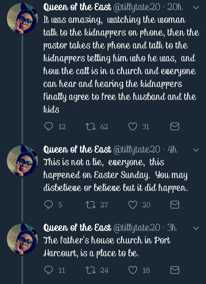 According to Queen of the east on Easter Sunday in church,her pastor during the sermon prophesied about a woman present whose husband and child has been kidnapped. The woman came forward the preacher man told her to dial a phone number and it happens to be the kidnappers number, he ordered they released the captive and according to her the kidnappers agreed. Read the SS for full gist after the cut…