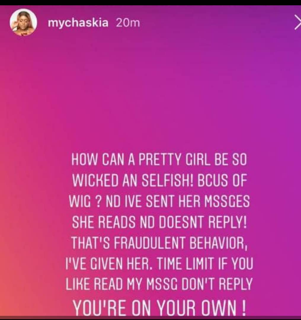 Instagram vendor @mychaskia took to her IG story to report 2018 face of Uniben queen @D_vickkie after she wrongfully claimed a wig that wasn’t hers and had it shipped to Benin City . According to the seller, Vickkie has since refused to reply her messages. Now matter Don cast!!!