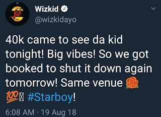 When your performance aura is mad! Nigerian’s Starboy Wizkid was booked to perform for just yesterday in Urban Vibes Festival in Cotonou but according to counts, it was sold out with over 40k people in attendance and he was rebooked to perform at the same venue, same time today.