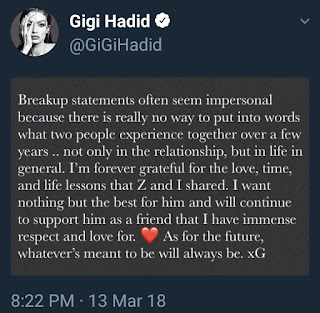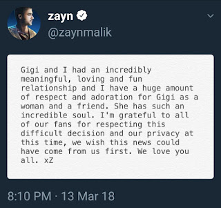 British Singer and former band member of One Direction and Model girlfriend now ex Gigi Hadid announces news of their breakup ,it looks to be a peaceful and amicable breakup as both of them remain close friends and share their undying love for each other.They hinted at a possible come back blaming the breakup on their busy schedule ,the couple have been dating since 2016 .